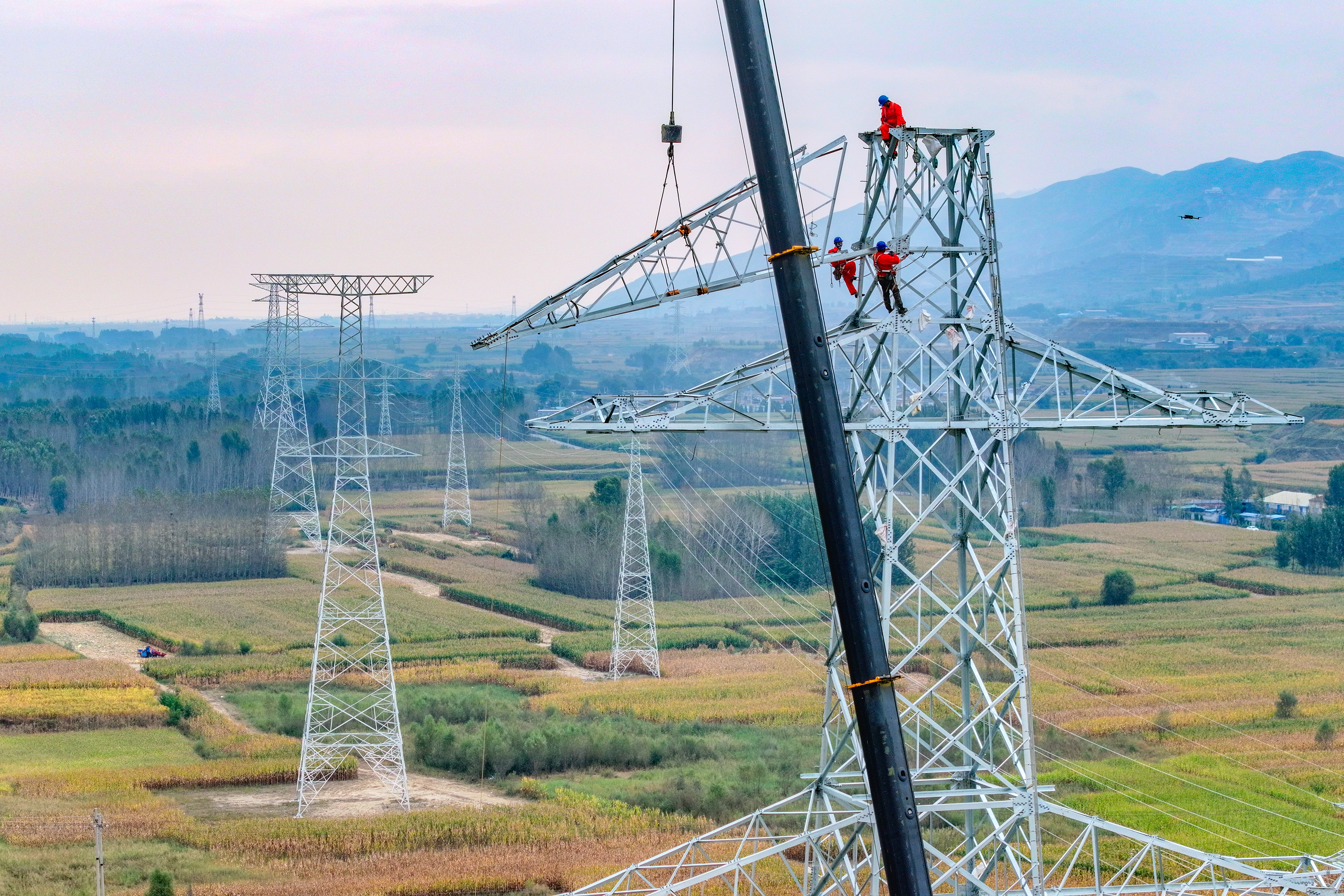 9月23日,國網(wǎng)山西送變電公司員工在忻州北~陽泉500千伏線路工程現(xiàn)場進(jìn)行流動式起重機(jī)組塔作業(yè)。