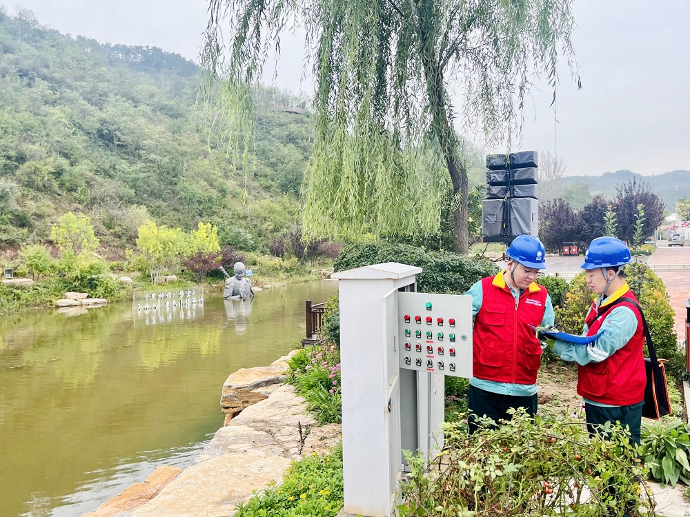 國網(wǎng)臨汾供電公司員工在浮山縣寨圪塔康養(yǎng)景區(qū)紅色小鎮(zhèn)開展專項用電檢查與服務(wù)保障工作,為“多彩寨圪塔 家國共此時”活動筑牢用電安全防線。