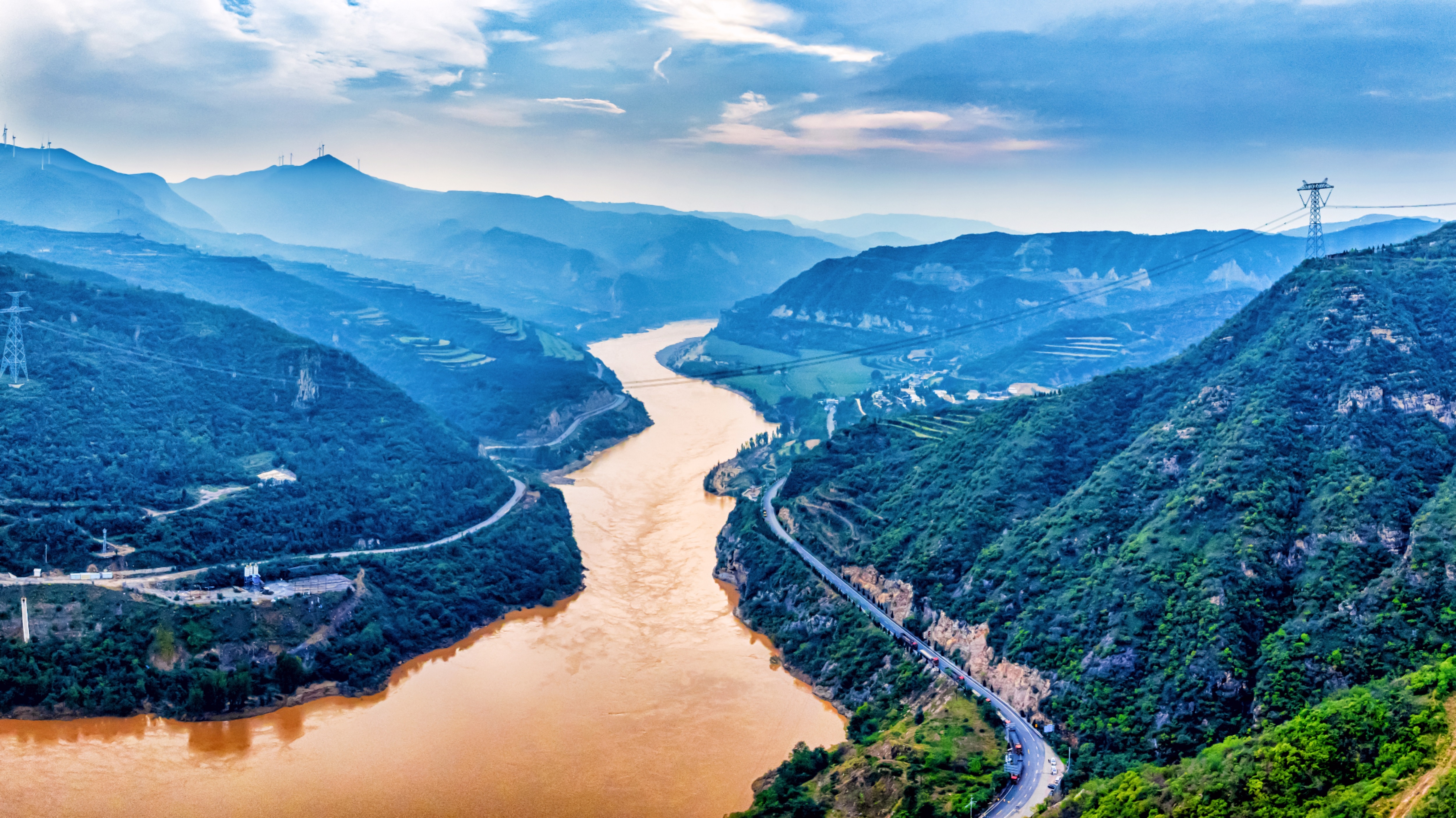 金秋時分,±800千伏特高壓靈紹線橫跨黃河的雄渾畫面。