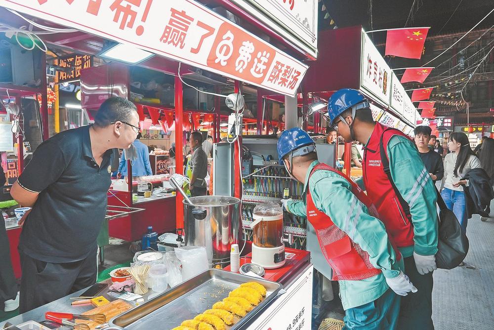 “附近商戶多,用電量大。風(fēng)機(jī)箱和變壓器是檢查重點(diǎn),測溫不能出錯(cuò)?!?0月2日,山西太原供電公司青年突擊隊(duì)隊(duì)長毛輕揚(yáng)在迎澤區(qū)鐘樓街開展用電檢查時(shí),向隊(duì)員們強(qiáng)調(diào)注意事項(xiàng)。該公司團(tuán)委組織青年突擊隊(duì)聯(lián)合黨員服務(wù)隊(duì)嚴(yán)密監(jiān)控景區(qū)、商業(yè)區(qū)等人員密集區(qū)域用電情況,及時(shí)發(fā)現(xiàn)并處置用電隱患。